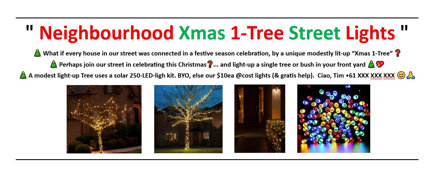 β¨ Our βNeighbourhood Xmas 1-Tree Street Lightsβ π is an initiative inviting suburban homes to setup a single Xmas tree with a modest solar-lights kit.